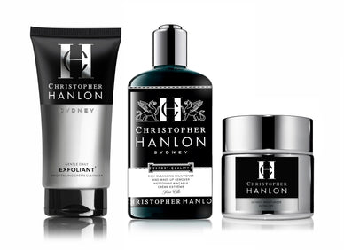 Erleben Sie das luxuriöse Geschenkset von *CHRISTOPHER HANLON™*, präsentiert in einer exklusiven Geschenkbox mit charakteristischem Band, goldbedrucktem Seidenpapier und einer modernen, umweltfreundlichen Einkaufstasche. Dieses 3-Schritte-Hautpflegesystem benötigt nur wenige Minuten pro Tag, um jugendliche, strahlende Haut zu erreichen.
